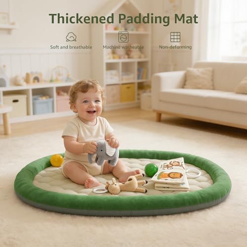 Comfortable Mat & Thickened – The tummy time mat features an oval shape measuring 36.61″ x 28.74″, with a raised and thickened outer edge (1.97 inch) to protect babies from bumps and falls. This design also adds weight to the play mat, preventing it from tipping over