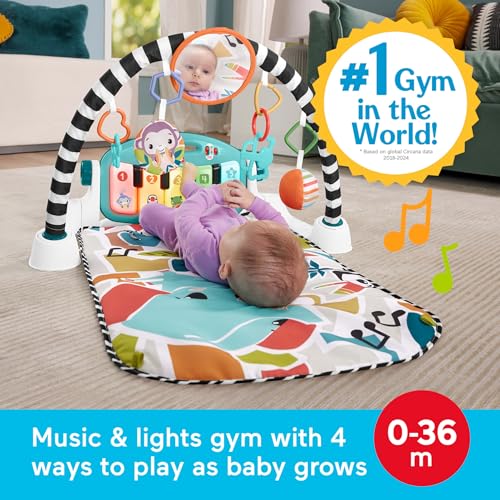 ​Get your baby moving, grooving (and learning) with the Glow and Grow Kick & Play Piano Gym from Fisher-Price. This soft baby activity mat features a repositionable, high-contrast toy arch with 10 linkable toys. The removable piano with 5 light-up keys features a multi-colored light show and has 4 musical settings that grow with baby from newborn to toddler. With 3 Smart Stages learning levels, and a bonus freestyle mode with real piano notes, you can keep things fresh and fun as your little virtuoso goes from lay and play and tummy time to sitting up and making music! Colors and decorations may vary.​ This product contains Spanish language-only spoken content.