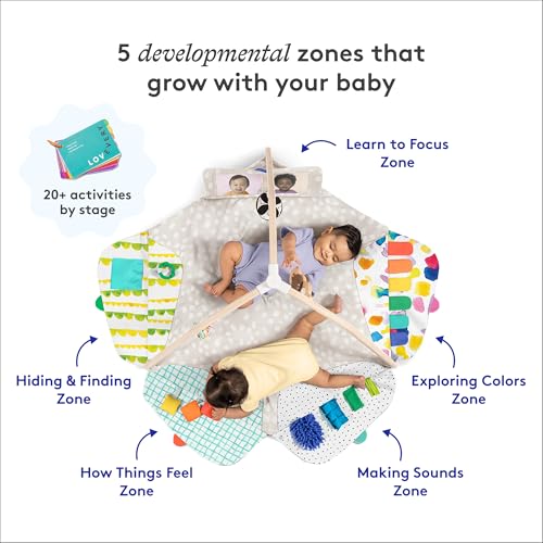 – Five development zones on the baby Play Mat that reveal or conceal to prevent overstimulation and promote learning: Learning to focus; Making sounds; How things feel; Hiding and finding; Exploring colors.