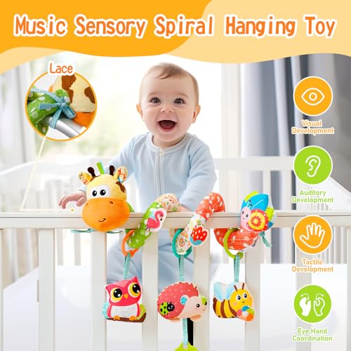 Jollybaby Crib Stroller Car Seat Toys for Baby 0-3-6-9-12 Months, Tummy Time Hanging Sensory Toys for Newborn with Music Box and Teether, Spiral Carseat Toy for Infant Boys Girls Gifts (Yellow)
