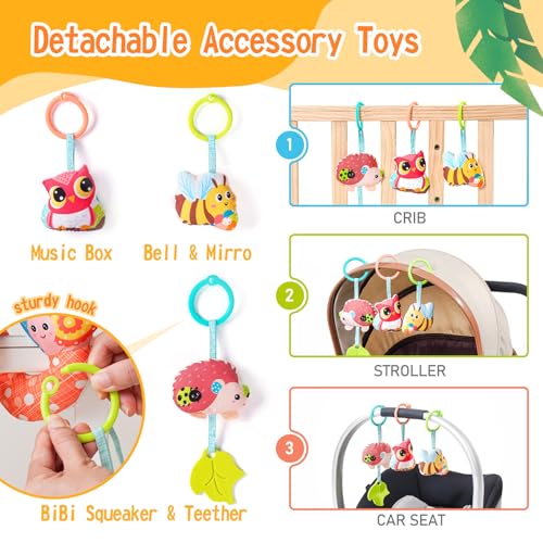 Bright Colors, Safe Materials, Fun! Happy car seat toy have a charming combination of bright colors that will capture your baby’s attention. Carseat toys hanging made from safe materials, it’s perfect for chewing and exploring. Baby toys 6-12 months included teether is ideal for soothing gum pain, making it a welcome companion during those teething stages.