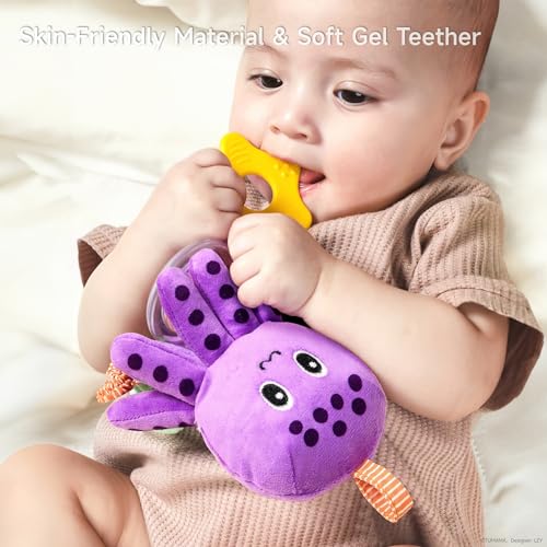 🐙Various Comfortable & Pleasant Voice to Amuse Baby–This baby sensory toy is built-in bells, rattles paper and sound device to help parents to play with babies. When baby grasp the gym ring rattle attached on the octopus, the octopus will shake and give out a nice voice to attract your baby. A good baby toy to promote your babies auditory senses and grab ability.