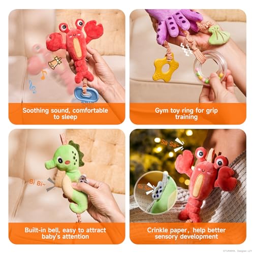 TUMAMA Baby Toys 0 3 6 12 Months, Hanging Stroller Toys Soft Marine Animal Crib Car Seat Toys, Crinkle Infant Rattles with Teether Squeaky Sensory Developmental Toy for Newborn
