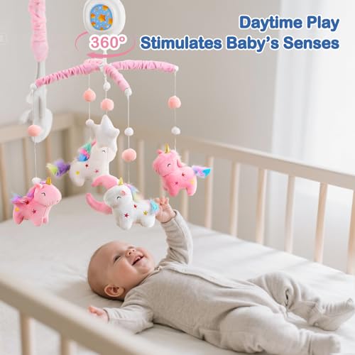Unicorn Baby Crib Mobile for Girls with Music Box (100+ Lullabies), Rotating Plush Crib Toys for Newborns, Infant, Baby Shower Gift