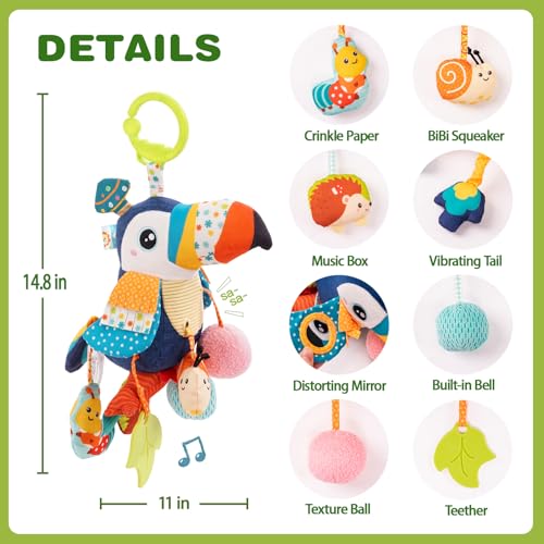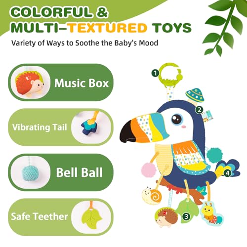 MUSICAL SENSORY HANGING TOY: the toucan multiple accessories car seat toys is designed to promote the sensory development of babies with its vibrant colors and a variety of textures. Each pull cord of carseat toys hanging is corresponds to different toys, including a soothing music box that plays a cheerful 14-second melody. Teether, crinkle paper, rattles toys can help alleviate discomfort during teething and auditory development in babies.