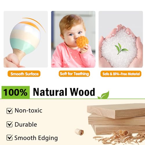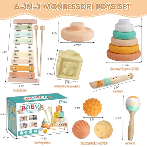 6 in 1 Baby Toys Set: Our baby toys 6-12 months include 6 soft building blocks, 5 stacking rings, 3 sensory balls, a baby xylophone with 2 wooden sticks, a maraca, and a clarinet. This baby xylophone, maracas, and clarinet feature a smooth texture and are perfectly sized for little hands, easy to hold