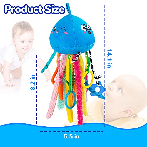 [Infant Sensory Toys] Our sensory toy is very soft and cute, featuring brightly colored jellyfish designs that promote your baby’s visual development. Kids sensory toys have 10 different textures of fabric, including velour, pineapple velvet, corduroy, mesh fabric etc, which are the “Tentacles” of jellyfish and can enrich baby’s tactile senses. Built-in bells can distract baby’s attention and stimulate the baby’s auditory development.