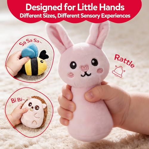 【Designed for Little Hands & Motor Skill Development】Thoughtfully created to support early motor skill development, each plush animal features a unique size, shape, and texture for little hands to explore. The flat bee is easy to grasp with crinkle wings, the fluffy hedgehog provides rich tactile feedback, and the bunny, fox, and monkey include built-in rattles—helping babies strengthen grip, hand coordination, and sensory awareness through play.