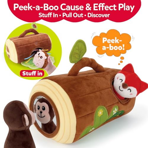 【Cause & Effect Sensory Play with Peek-a-Boo Fun】The soft tree stump encourages interactive discovery through simple cause-and-effect play. Babies can explore their reflection in the built-in baby mirror to support early self-awareness, enjoy fun sounds from the sensory details, and practice taking the animals in and out through the back opening. The front leaf flap adds peek-a-boo fun, supporting early learning through playful interaction.