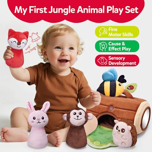 【Jungle Animal Plush Sensory Play Set】A jungle-themed plush animal play set where five adorable animal friends—bunny, fox, monkey, hedgehog, and bee—live together inside a soft tree stump home. Designed as engaging baby sensory toys for 6–12 months, this cozy animal world encourages gentle exploration, imaginative play, and hands-on discovery for little learners.
