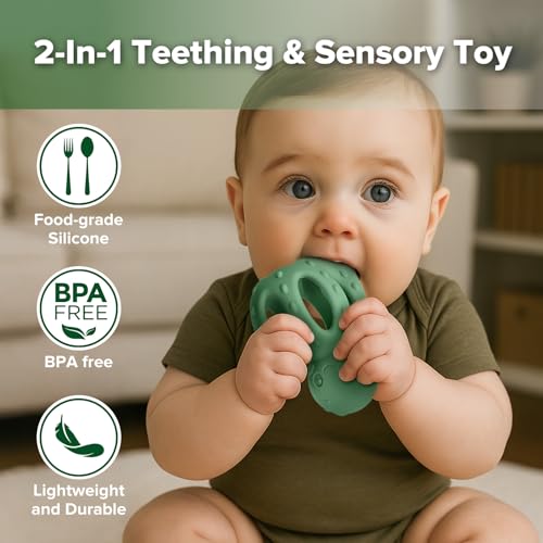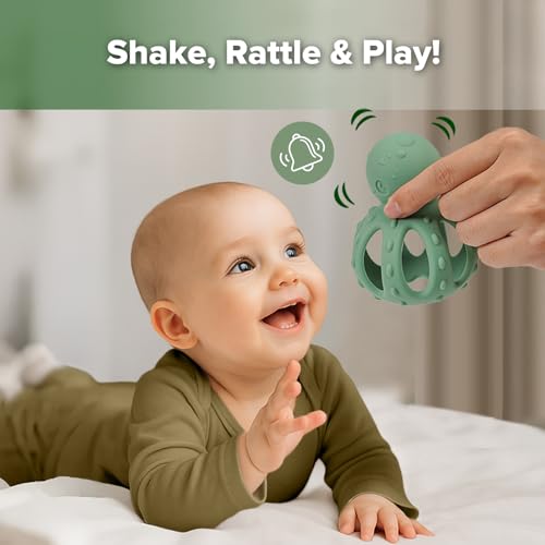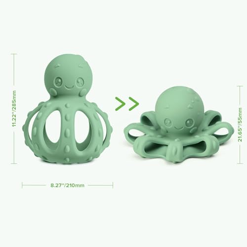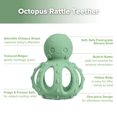 haakaa 2-in-1 Baby Teething Toy,Octopus Teether with Gentle Rattle,Soft Textured Teether for Sore Gums,Easy to Grasp Sensory Toy for Babies 3M+,Pea Green