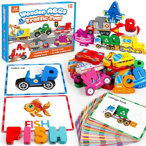 Vanmor Wooden Vehicle Alphabet Puzzle for Toddlers, Traffic ABC Letter Sight Words Matching Game with 52 Blocks and Flash Cards, Spelling Game Toys, Kindergarten Preschool Learning Activities