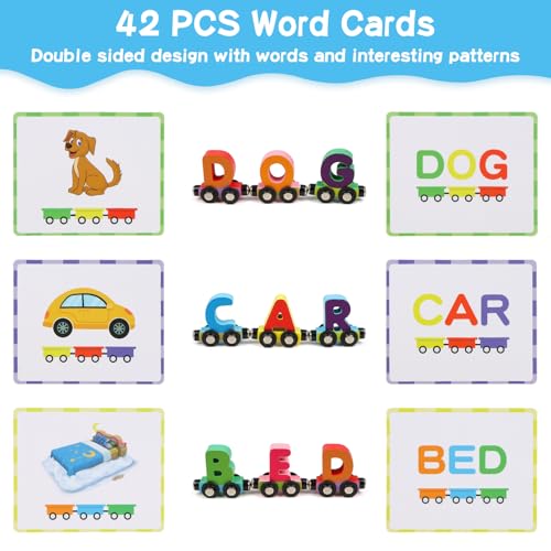 Great Preschool Educational Toy: Alphabet train toy is designed as the preschool learning activity sets for toddlers. It is easy for kids to memorize words by combining the letter trains with the word cards. Toddlers not only learn simple words by combing letter trains but also play trains with friends. These alphabet car help kids to study letters, promote imagination, hand-eye coordination, fine motor skills, basic cognitive skills, color recognition, visual perception
