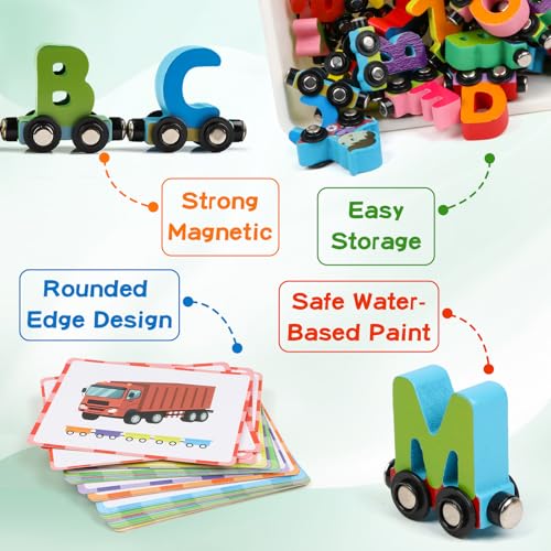 Wondertoys Wooden Alphabet Train Toy 27 PCS Magnetic Alphabet ABC Letter Train Set Includes 42 PCS Flash Cards, 1 Engine and 1 Storage Box for Toddlers Kids Boys and Girls