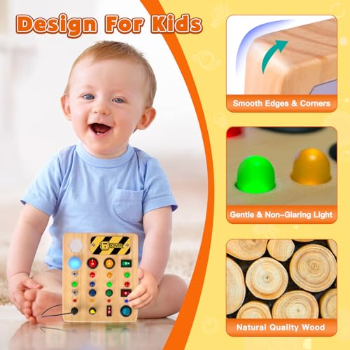 ✔ Light-Up Sensory Fun – Features 12 colorful LED lights, 12 buttons, knob switches, plugs, and a mirror to keep kids engaged for hours