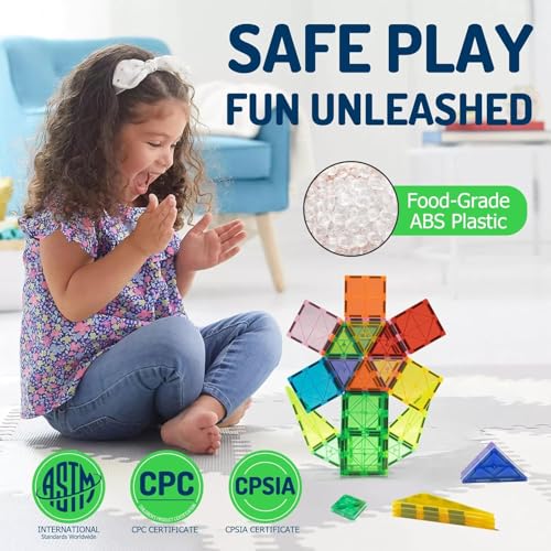Safe & Durable Kids Toys — Our magnetic tiles toys are “CPSIA” and “ASTM” certified and do not contain any harmful gases. Made of safe and durable ABS plastic with advanced ultrasonic welding technology. The smooth surface and rounded edges allow children to play safely without causing scratches or damage. This is a perfect set of toys for 3 4 5 6 7 year old