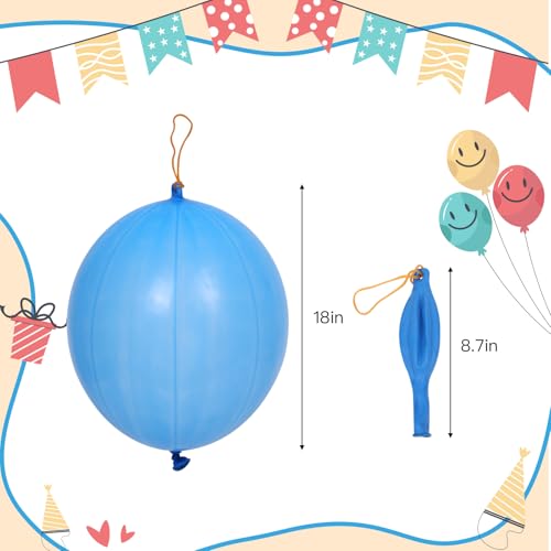 Package Includes: 30pcs 18 inch color punch balloons with rubber band handles contains 7 colors: red, violet, rose, orange, yellow, green, blue