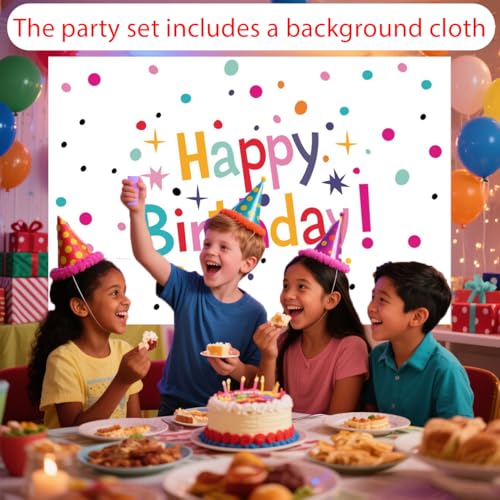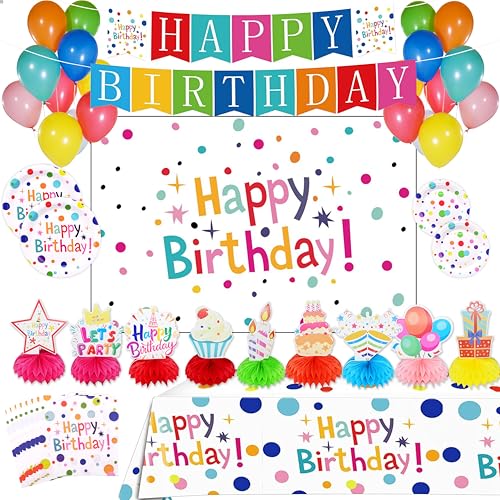 Happy Birthday Decorations Set for Kids – Party Supplies Kit with Honeycomb Balls, Banner, Backdrop, Balloons, Tablecloth, Plates, Napkins- Birthday Party Decor for Boys Girls