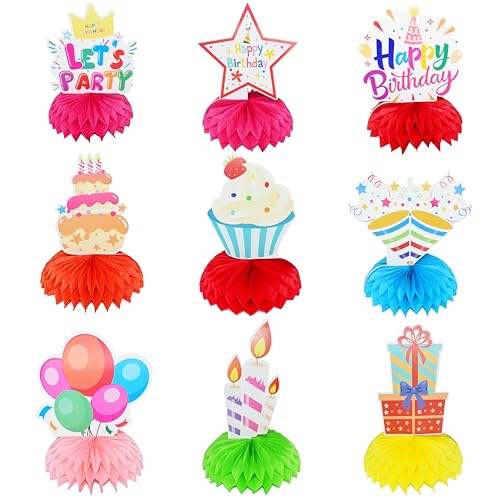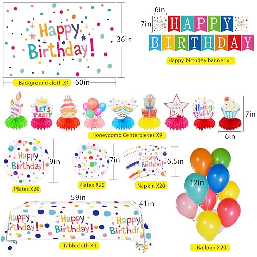 1.【92pcs Happy Birthday Decorations set you need】 This birthday party decorations kit includes everything you need to celebrate in style: 20pcs 7″ birthday plates, 20pcs 9″ birthday plates, 20pc napkins, 1pc tablecloth, 1pc ”Happy Birthday” banner, 1pc ”Happy Birthday” backdrop, 9pcs honeycomb centerpieces, and 20pcs 12″ matte balloons in colorful mixed vibrant colors