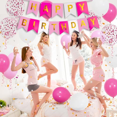 Pink Birthday Decorations, Happy Birthday Banner, 16 pcs 12 inch Balloons with 2 Ribbons for Girl and Women Party Decoration