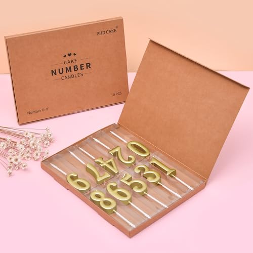 PHD CAKE 10-Pieces Gold Numeral Birthday Candles, Cake Numeral Candles Number 0-9 Glitter Cake Topper Decoration for Birthday,Wedding Anniversary,Party Celebration