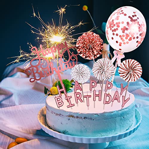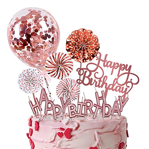 Rose Gold Cake Topper Decorations with Happy Birthday Candles, Acrylic Birthday Cake Topper, Confetti Balloon and Paper Fans for Rose Gold Theme Birthday Party Décor
