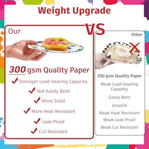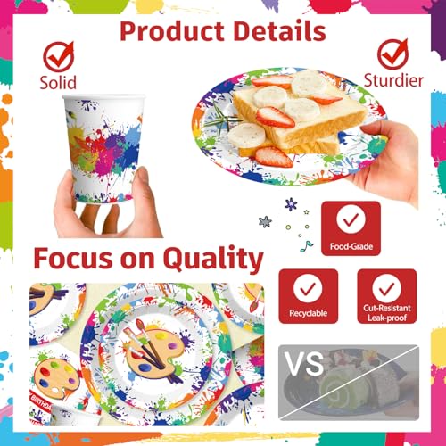 【Superior materials:】Most of our art party supplies are made of solid white cardboard, using excellent printing technology, not easy to fade, our art party plates are made from 300gsm cardboard. they are sturdy and attractive. not microwave safe. the paint party tablecloths are made of plastic, disposable design allows quick cleanup after the paint splatter party. more fun, less cleanup