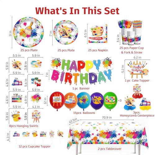 【Rich paint party decorations:】Our art party decorations are personal and durable, including 1 paint party banner, 8 hanging swirls, 8 single swirls, 1 art party cake topper, 12 cupcake toppers, 3 centerpieces, 15 paint party balloons, 2 tablecloths, 25 sets: 7-inch plate, 9-inch plate, paper cup, napkin, fork, straw. everything you need for a coordinated paint party are included in one package