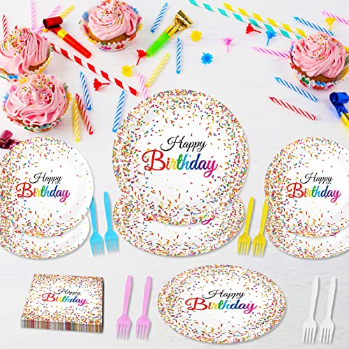 96 Pieces Happy Birthday Plates and Napkins Party Supplies for Confetti Sprinkles Theme Table Decorations Pastel Birthday Party Tableware Donut Paper Plates Napkins Forks Favors for 24 Guests.