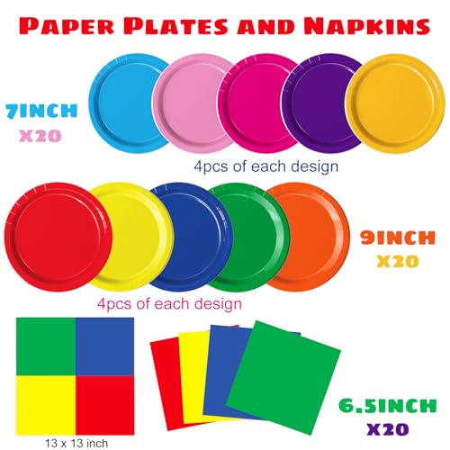 Colorful Plates and Napkins: This colorful party decorations includes 20 × 9” dinner plates (up to 5 designs), 20 × 7” dessert plates (up to 5 designs), and 20 paper napkins (up to 4 designs). It adds a cheerful touch to your table setting—perfect for any celebration or event where a pop of color is needed, making your festivities
