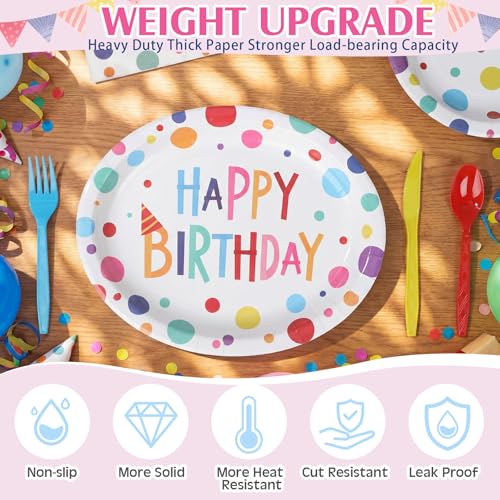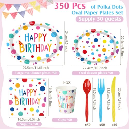 Pajean 350 Pcs Happy Birthday Party Supplies Oval Paper Plates Set with 12 inch Disposable Birthday Oval Plates and Napkins Colorful Dots Design Heavy Duty Paper Dinnerware Set for 50 Guests