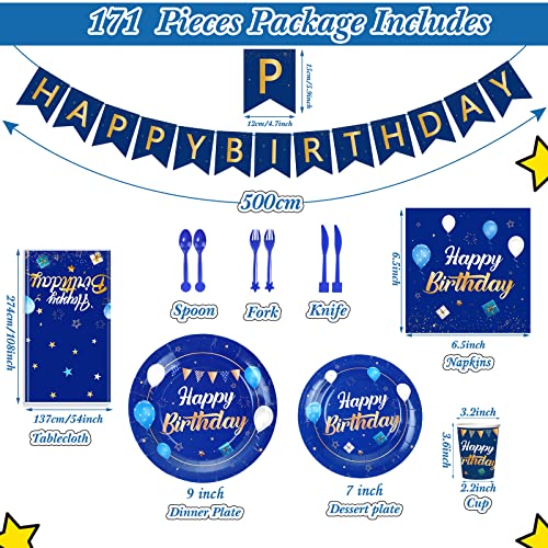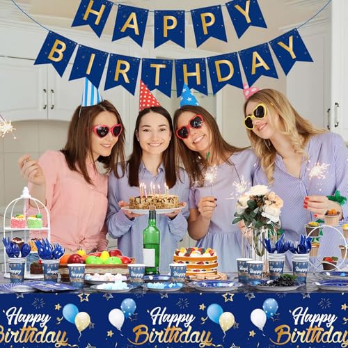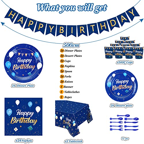 Pajean Blue Happy Birthday Party Tableware Set Birthday Decoration Banner and Tablecloths Decoration Plates Cups Napkins Dinnerware for 24 Guests Party Supplies(Blue and Gold)