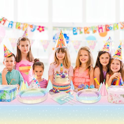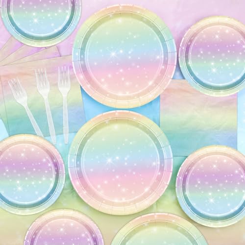 Pastel Rainbow Party Supplies for 20 Guests – Disposable Tableware Set Includes Pastel Paper Plates, Napkins, Forks, Tablecloth for Girls Birthday Party, Baby Shower