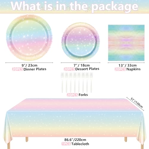 Pastel Rainbow Themed Party Supplies: Package includes: 20 x 9” dinner plates, 20 x 7” dessert plates, 20 x napkins, 20 x forks, 1 x pastel rainbow tablecloth.