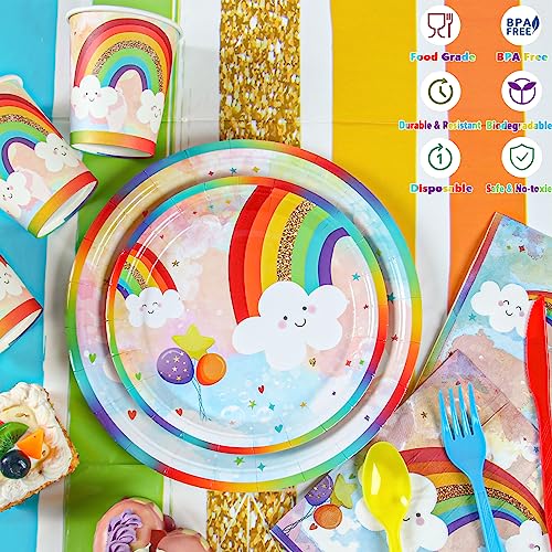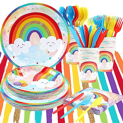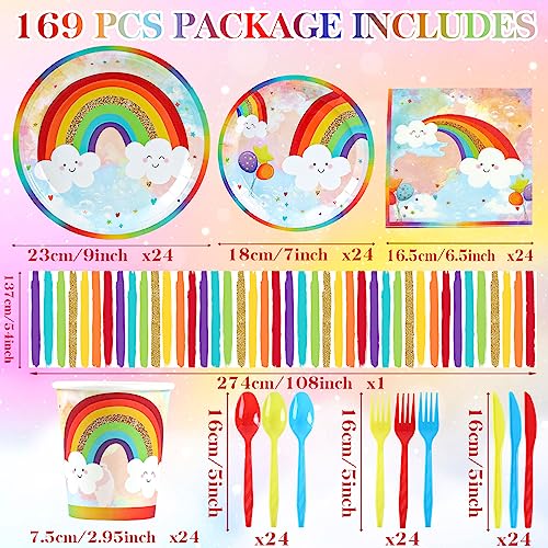 Rainbow Party Supplies, Happy Birthday Decorations for Girls & Boys -169pcs Rainbow Party Tableware Set Include 9″ and 7″ Party Plates and Napkins Cups Utensils with Tablecloth for 24 Guests