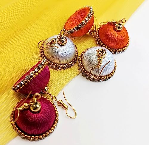 Indian Traditional Jhumka (Drop Earrings). 10 Colored Pairs . Colors may differ. Material is Febric Silky Thread with small artificial diamonds Haldi Kumkum return gift item. Great item for Gifting.