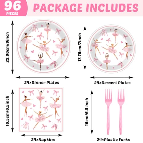 Package Includes:The ballerina tableware set includes 24 9 inch paper plates and 24 7 inch paper plates, 24 napkins, 24 pink forks. Our dancing girl party plates and napkins, with sufficient size and quantity, can meet the needs of large gatherings and impress your family and friends