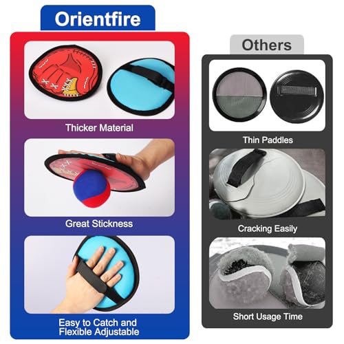 【Upgraded Thicker Paddles】Our toss and catch ball game set made of high-quality, durable and non-breakable materials with high toughness, Instead of thin plastic paddles. These are sturdy, durable, have a soft touch, better stickiness, and children can easily catch and throw them. It provides a safe and enjoyable experience. And our rackets are lined with waterproof materials, making them suitable for outdoor use, beaches, swimming pools, water areas, camping, backyards and parks.