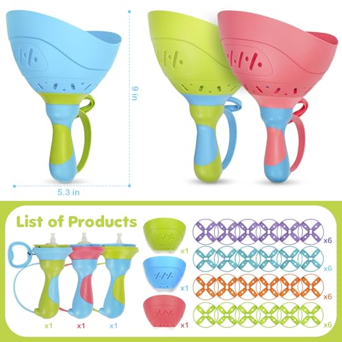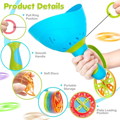 Launch & Catch Flying Game Toy: This outdoor toy includes three handheld launchers and 24 colorful discs. It features classic manual toss and catch gameplay. Kids simply pull the ring on the launcher to launch the discs into the air. During play, children can pass the discs to their friends or use their own launcher to catch them, making it a fun activity for group play, family gatherings, or solo play.