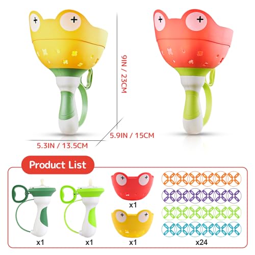 Games for Kids Ages 4-8: Outdoor games with 24 discs and 2 Frog Hand Launch Catcher. Easy to play. Children just need to pull the launchers pull ring and the frog’s head will launch flying disc, which children need to catch with launchers, and children will have fun trying to chasing them. The one who catches the most discs wins