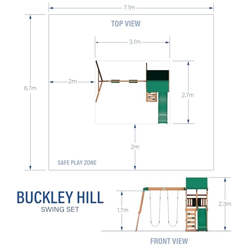 The Buckley Hill Swing Set turns small backyards into adventure-packed playgrounds, offering a variety of features perfectly suited for younger children. The breezy upper play deck features a mix of mesh and vertical wood pickets, creating an airy retreat protected by a canopy roof. Kids can challenge themselves on the rock wall ladder, reaching new heights before zooming down the 6-foot speedy wave slide. The versatile lower play space can be filled with sand for beach-themed fun or used for convenient toy storage. For little artists, a built-in chalkboard invites colorful creations and imaginative play, while two heavy-duty belt swings offer classic playground fun as children enjoy fresh air and sky-high adventures. The playful rock wall ladder adds an exciting way to access the raised deck, encouraging active play while building confidence. Crafted from naturally durable cedar wood that provides lasting strength and resistance to decay, this charming backyard playset delivers endless outdoor adventures. The ready-to-assemble design pairs with guided instructions through the interactive BILT app for easier installation. Backed by a 5-year warranty, the Backyard Discovery Buckley Hill Swing Set creates the perfect outdoor play space where young imaginations can grow while making special memories right in your backyard.