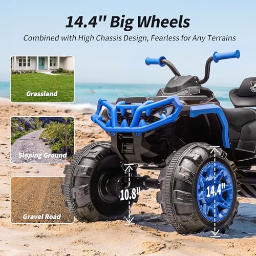 14.4″ LARGE TIRES: With large tires and a high ground clearance, this kids 24v ride on atv is built to handle a variety of terrains, from grass and sand to mud with ease.