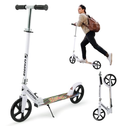 Foldable Kick Scooters for Kids 8-12, 8″ Wheels with Shock Absorption, 4-Level Adjustable Height, 240 lbs Capacity, Rear Brakes & Lightweight Design for Commuting, School & Park Rides, White