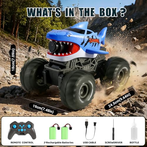 【All-Terrain Off-Road Shark Monster Truck】The monster truck is a blue shark designed, 4WD Off-road tires and waterproof construction. The amphibious remote control car can easily conquer road, grass, sand, gravel, mud terrain, beach, pool and snow.