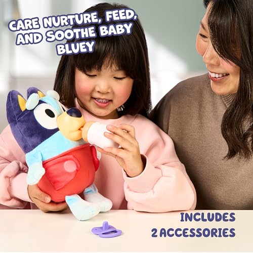 Baby Bluey Toy: Encourage imaginative caregiving in your child through pretend feeding and cuddling of our Bluey baby plush toys inspired by the Bluey episode “Baby Race”; this Bluey baby toy includes accessories such as baby bottle and baby pacifier