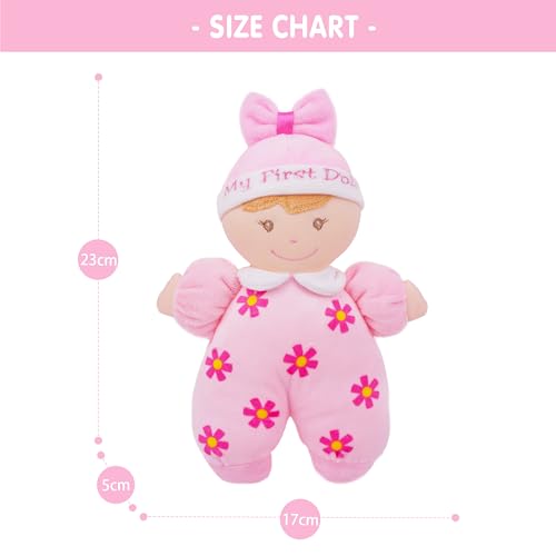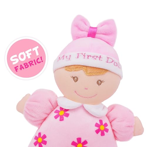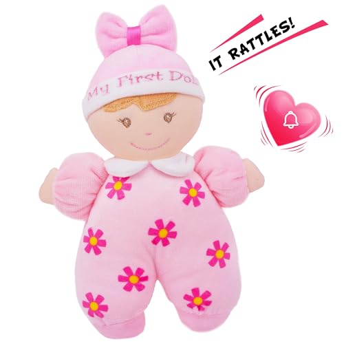 June Garden 9″ My First Doll Sienna – Soft Plush Baby Doll with Rattle – Pink Outfit