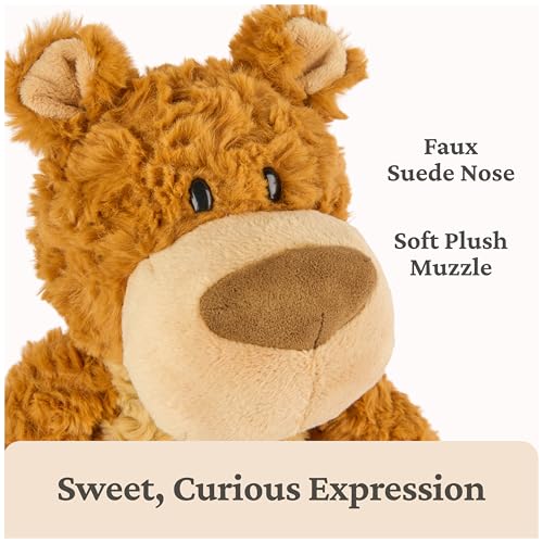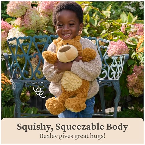 BEXLEY TEDDY BEAR: Bexley is a cute, amber-colored bear with a large tan muzzle, big, weighted paws with faux-suede paw pads, and a curious, eager expression. His huggable 12” body and soft swirled plush make him a cuddly pal and gift for all ages.