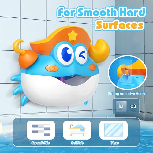 STRONG ADHESIVE MOUNT: Our strong adhesive hooks can be adhered to dry smooth surfaces, such as tiles, and glass to hold the bubble machine securely in place, much stronger than suction cups, so you no longer need to worry about the bathtub bubble machine falling into the bathtub and being damaged..Please note:drain after use and store in a dry place.