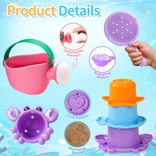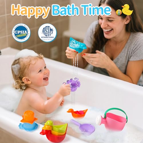 【MULTI-FUNCTIONAL WATER TOYS】The bath toys for kids ages 1-3 work for bathtubs, pools, water parks and beaches! Babies can use the watering can to help mom water flowers or wash veggies (great little helpers). Stacking cups have unique bottom shapes for beach stamping (hearts, stars, triangles). Duck cups even “fish out” floating toys. The bath toys for toddlers boost kids’ thinking & creativity, accompanying them in all water moments for endless fun.