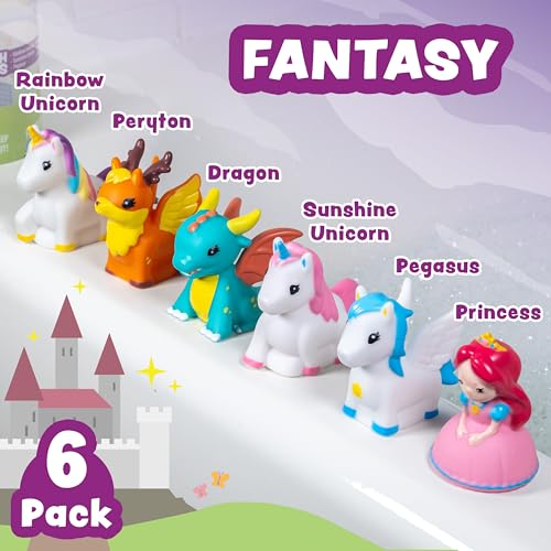 FANTASY 6 PACK: Set includes (6) exclusive Watertight Bath Toys featuring Unicorns & Magical Friends – Rainbow Unicorn, Sunshine Unicorn, Pegasus, Peryton, Dragon & Princess – must-have tub toys for a magical kids bath!